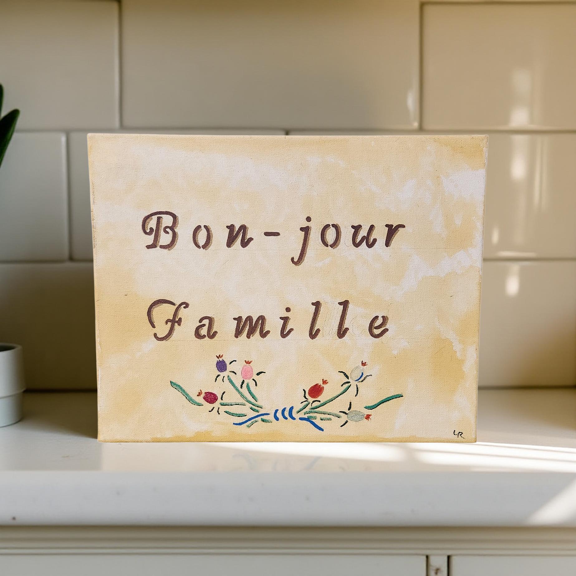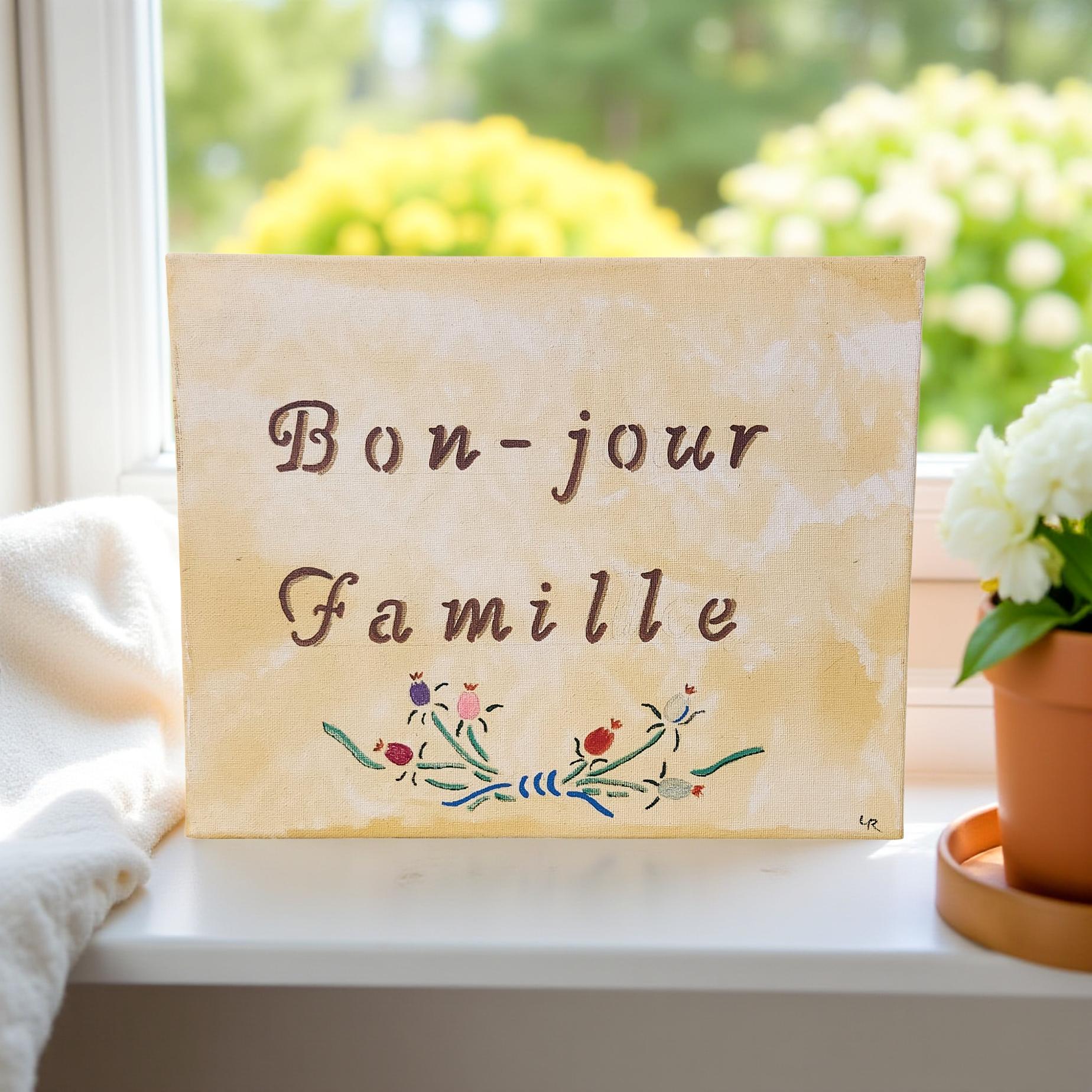 This "Bon-jour Famille" painting is by Mrs. Linda Richard of Abbeville Louisiana. Dimensions are 14 inches wide by 11 inches tall.