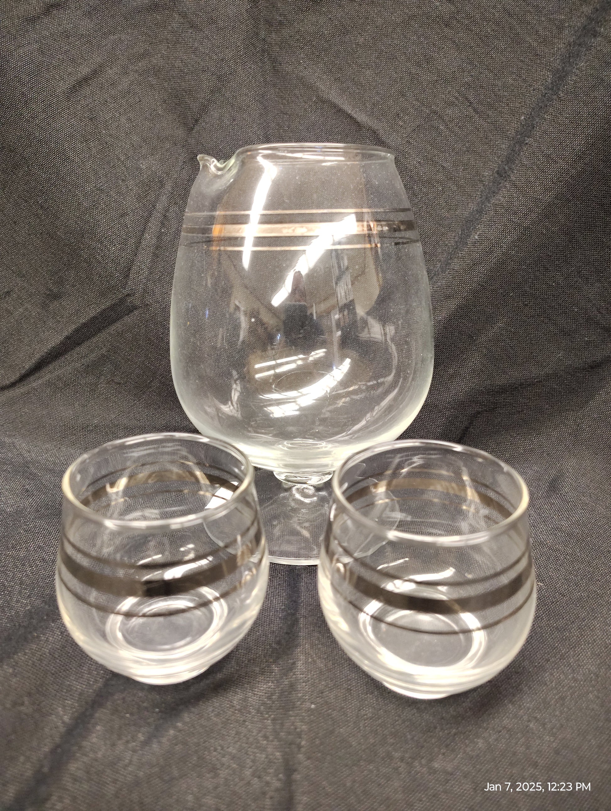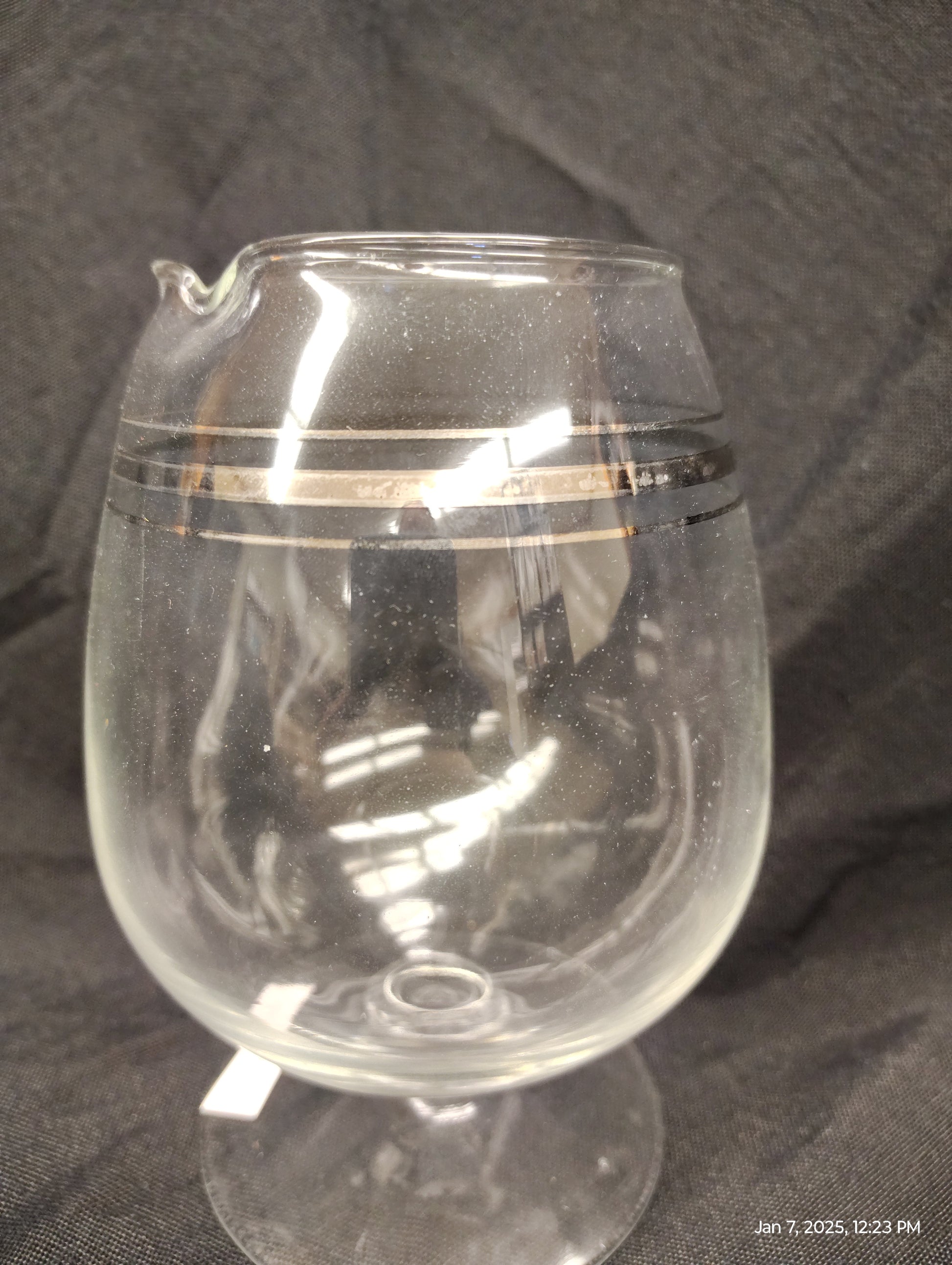 This Brandy Snifter set features a clear glass design with silver plated lines on the Brandy snifter and the six piece glass set. The Brandy Snifter is 6 in tall by 3 in in diameter at the rim and 3.5 in in diameter at the base. The Brandy glasses are 2.5 in tall and 2 in in diameter at the rim. The glasses are free of chips and cracks and in great condition, and the Brandy sniffer is in great condition with no chips and cracks but there is some slight wear in the silver banding at the top.