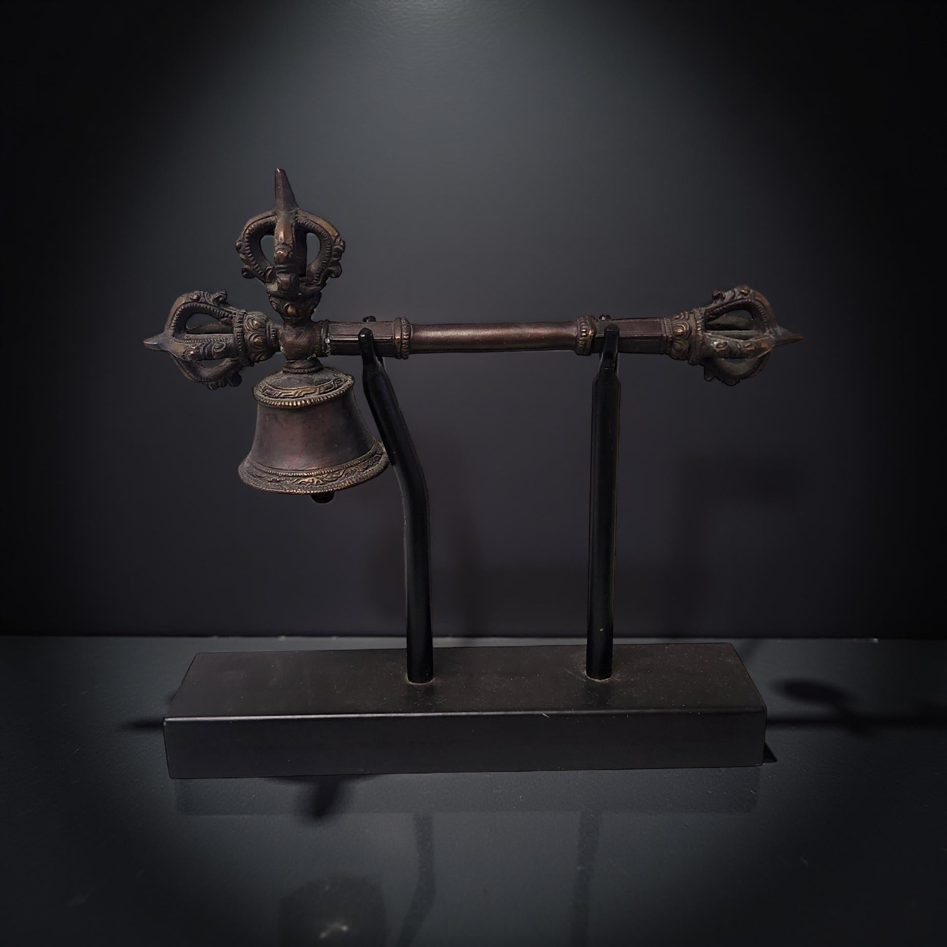 Antique Asian Bronze Tibetan Ceremonial Vajra Bell with Stand (Drilbu & Dorje)