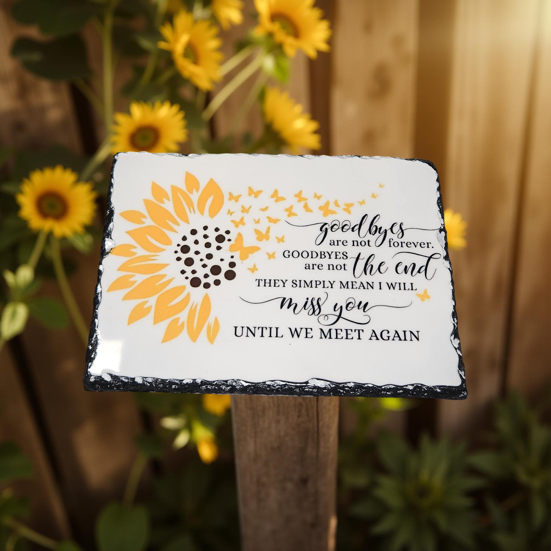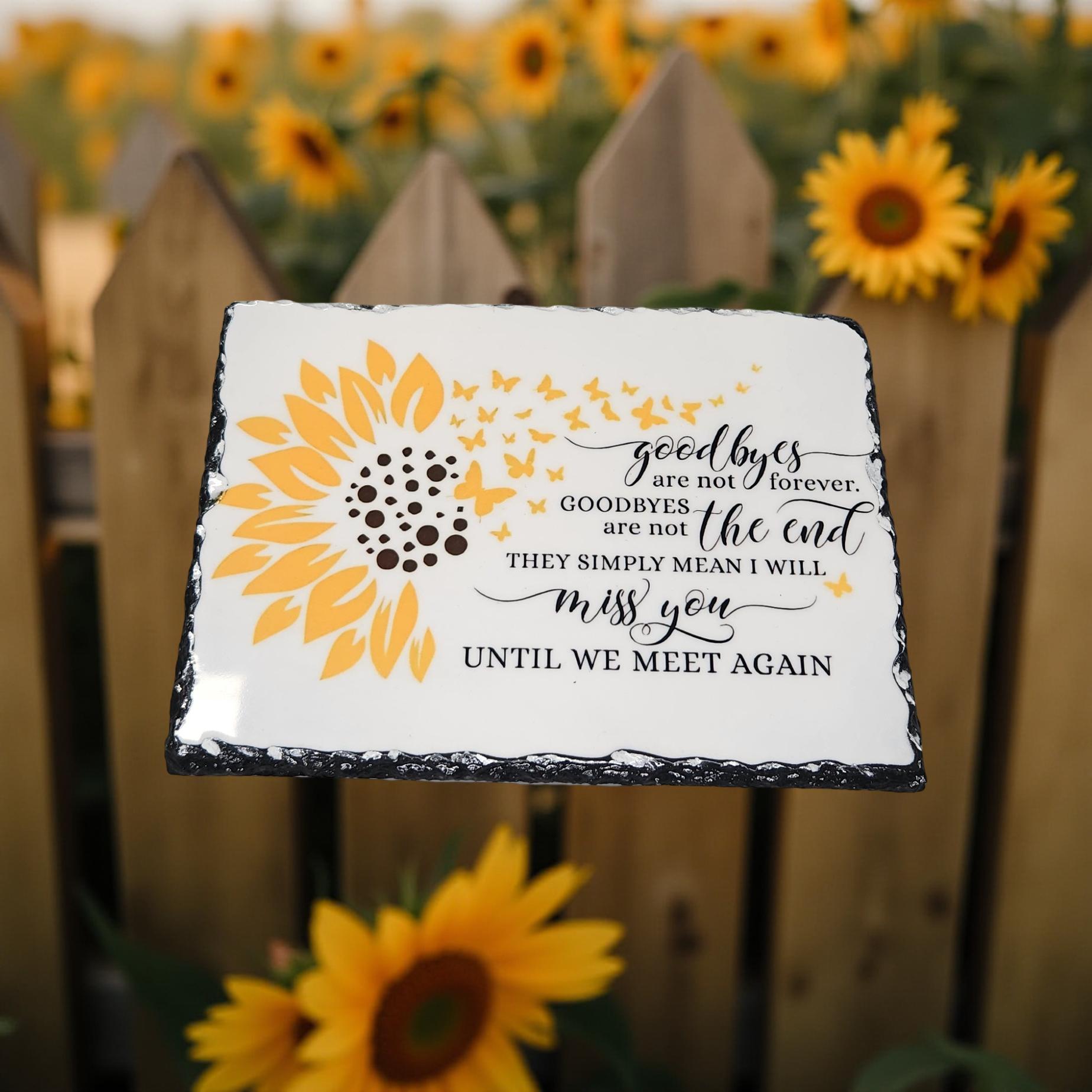 Add a touch of elegance to your outdoor space with these decorative butterfly and sunflower slates. Hand-crafted and designed to honor your loved ones, these unique decorative pieces are perfect for any garden or patio setting. Make a beautiful addition to your space with these personalized and heartfelt decorative slates.