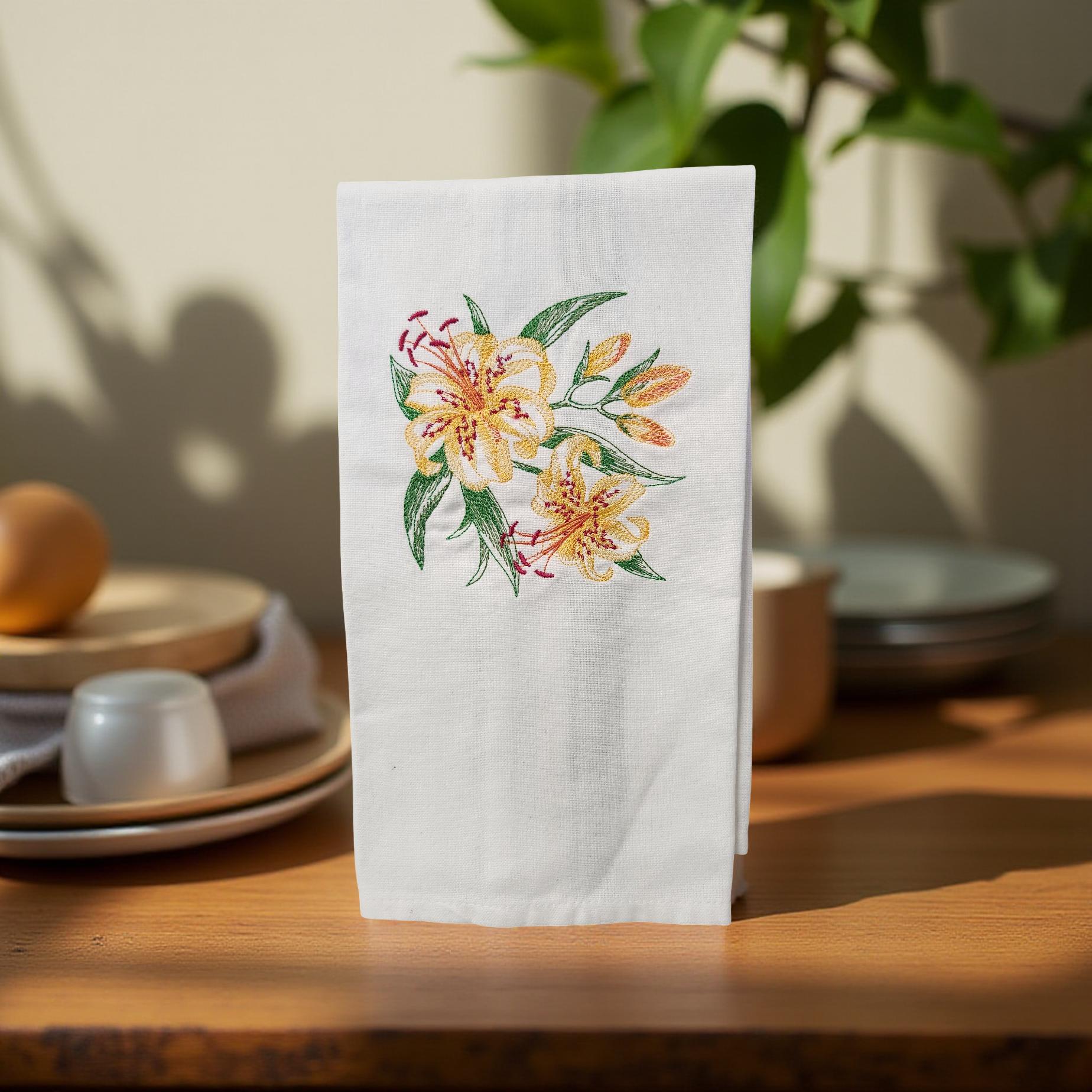 Bring the beauty of blooming gardens into your home with these hand-crafted embroidered Day Lily and floral-themed hand towels. Each towel is made from soft, absorbent cotton and features intricate, hand-stitched designs of vibrant day lilies, delicate blossoms, and leafy accents. The embroidery captures the elegance and charm of nature, making each towel a unique work of art.