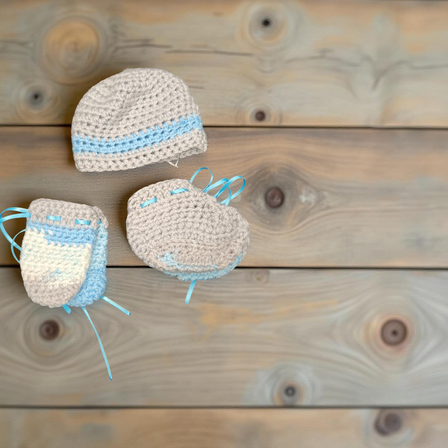 Set of Hand-Crafted Crochet Hat, Mittens, and Booties