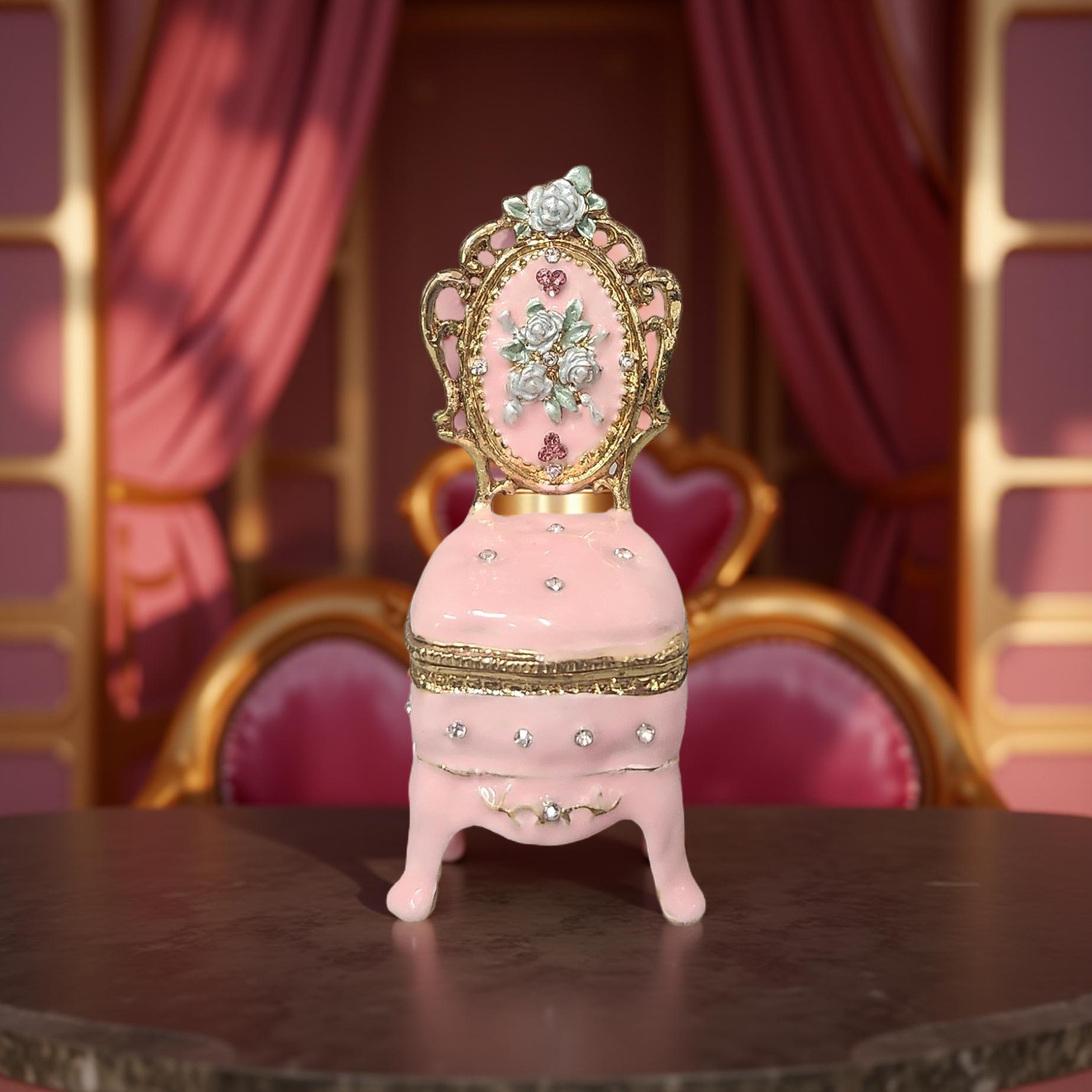 Add a touch of vintage elegance to your décor with this pink jeweled chair trinket box, a miniature masterpiece that blends function with charm. Crafted from metal and finished in soft pink enamel, the chair features ornate Victorian-style scrollwork, sparkling rhinestone accents, and delicate floral details. The hinged seat lifts to reveal a small compartment—perfect for storing rings, earrings, or tiny keepsakes.
