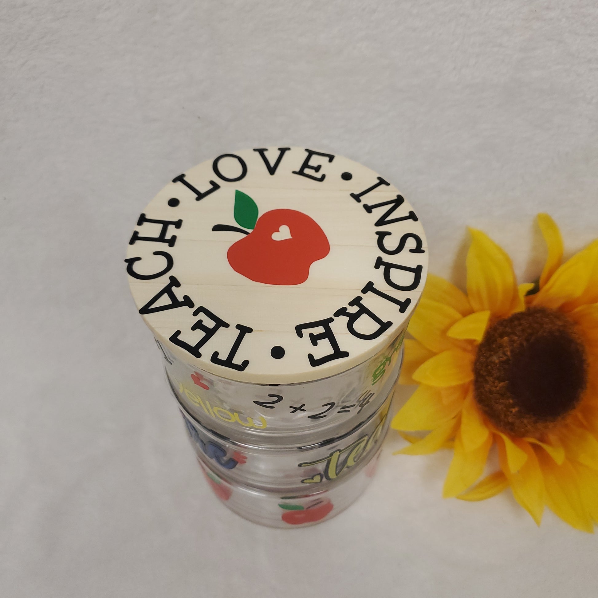 This stackable container is perfect for a teacher appreciation gift. It is 3 separate glass dishes the stack together with a wooden top.