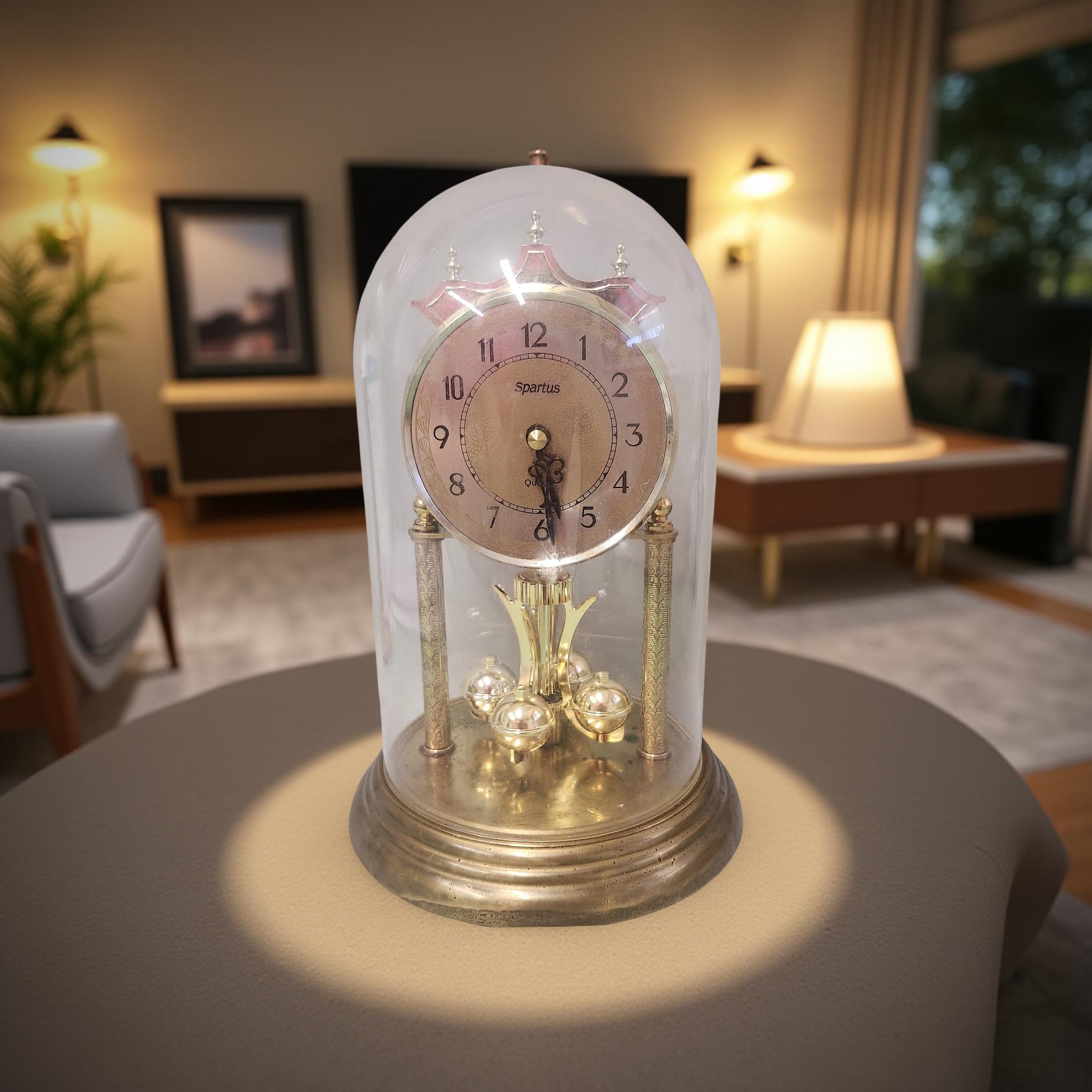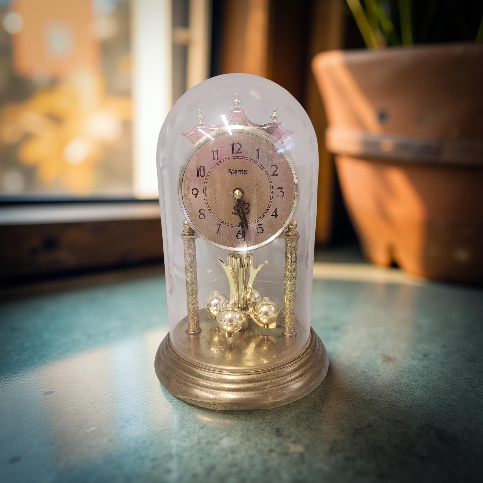 This 6-in round Sparta's mantle cloth and 6 in and diameter. The clock works and the cover is made of glass not plastic.